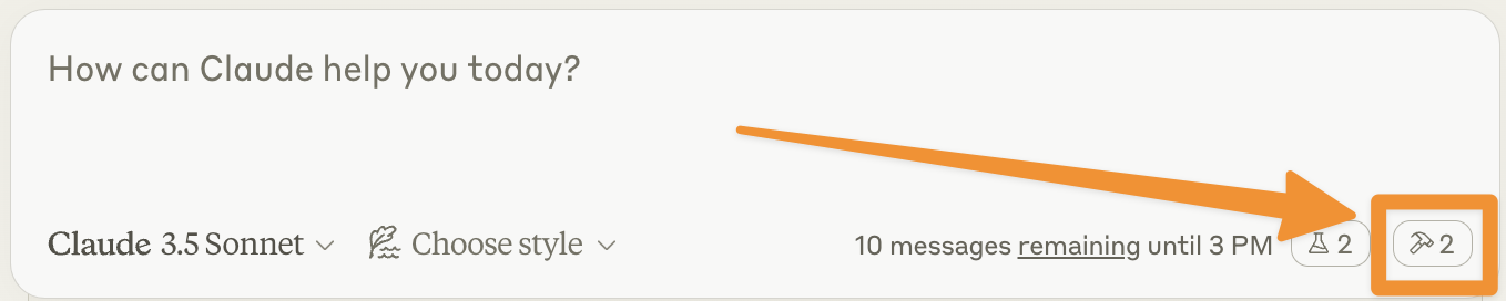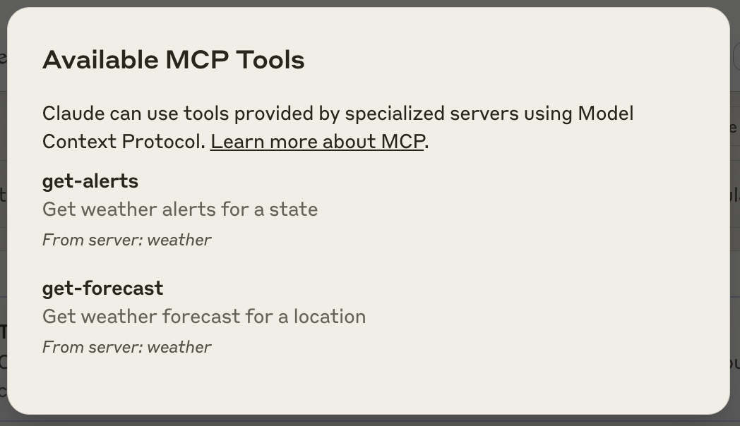 Let’s make sure Claude for Desktop is picking up the two tools we’ve exposed in our weather server. You can do this by looking for the hammer icon: