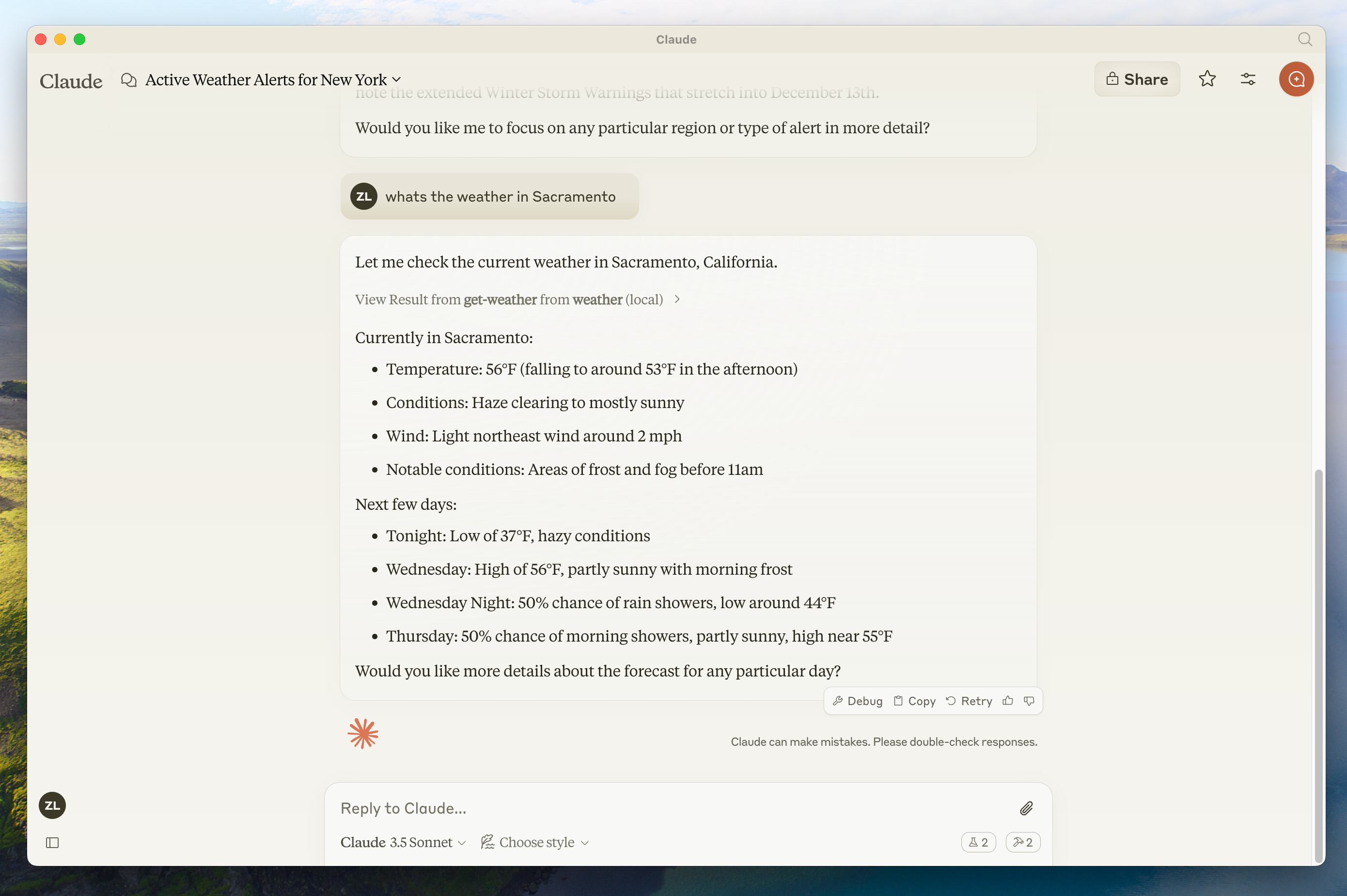 Many LLMs (including Claude) do not currently have the ability to fetch the forecast and severe weather alerts. Let’s use MCP to solve that! We’ll build a server that exposes two tools: get-alerts and get-forecast. Then we’ll connect the server to an MCP host (in this case, Claude for Desktop):